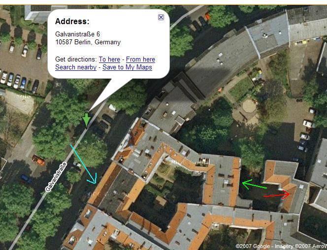 Cliquez sur la photo pour mieux voir. La flèche rouge représente ma fenêtre, et la verte la photo ci-dessus (ce que je vois de la fenêtre). La bleue, c’est l’entrée principale. Donc je traverse deux petites cours jusqu’à la porte de ma « section » d’immeuble (la petite saillie à côté de la fenêtre, dans le coin; l’escalier se trouve là — eh non, pas d’ascenseur, et c’est au 4e étage!)