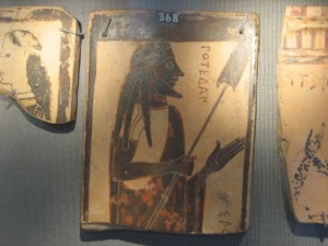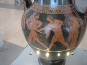 Malheureusement, la photo ne fait pas justice à l’oeuvre. Les détails sur cette amphore étaient écoeurants. Ici, on voit Apollon qui essaie de reprendre un tripode que Hercule (Héraclès) a volé à Artemis, la soeur d’Apollon (à droite). On reconnaît Hercule par la peau de lion qu’il porte presque toujours. Ah, et le tripode, on s’en servait pour y attacher les chevaux. Malheureusement, je ne me souviens plus qui est à l’extrême gauche (et qu’on voit à peine).