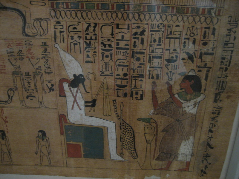 Une tentative de macro sur un papyrus. Côté papyrus, je me souviens d’un « livre de la mort », déroulé sur toute sa longueur (plusieurs mètres). Il était tout plein de prières à différents dieux, et contenait des passages comme « Oh (un dieu quelconque), sache que je n’ai jamais commis (tel ou tel péché qui pourrait choquer ledit dieu) », sur des pages et des pages.