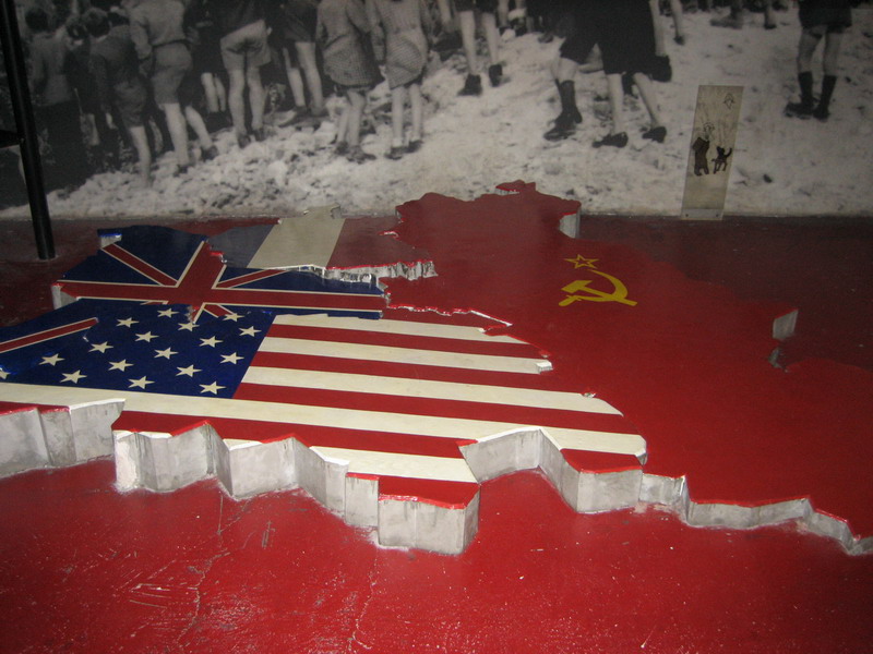 La ville divisée en 4 secteurs : français, britannique, américain (combinés pour former Berlin-Ouest) et soviétique (Berlin-Est).