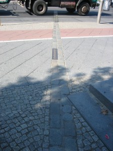 Ça, c’est l’ancien tracé du mur de Berlin — vous pouvez probablement lire l’inscription BERLINER MAUER 1961-1989. Voici le tracé du mur dans toute la ville. À peu près au milieu, on peut voir un très grand espace vert avec un rond point dedans. Bon, à l’est de cet espace vert ya la porte de Brandenbourg. Le mur va vers le sud et traverse la Potsdamer Platz (là où se trouve le Sony Center). C’est là que j’ai pris cette photo.