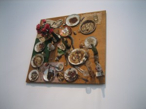 Eh oui, la table est fixée au mur. Le message? Sais pas, j’y ai vu quelque chose sur la consommation. Ça me semble vaguement dégueu. Autant une table apprêtée est « belle », autant qu’elle est quasi-repoussante une fois que tout le monde a fini. Sais pas pourquoi. Peut-être parce que nous aussi, nous sommes repoussants? HO HO!