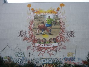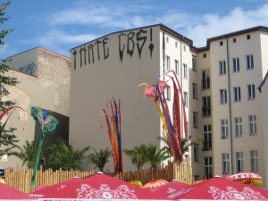 J’ai décidé de revisiter le quartier Prenzlauer Berg, le refuge des artistes. C’était là, la maison avec les impacts de balles. Donc j’arrive finalement vers 11 h, et je décide de me rendre avec quelques détours au Tacheles, un squat bourré (certains diront « infesté », ho ho) d’artistes. Tacheles est plus dans le Mitte que dans Prenzlauer, mais anyway. Son principal attrait est d’avoir résisté depuis 1990 aux assauts des promoteurs immobiliers et des touristes, à tel point que la ville a décidé de s’entendre avec eux.