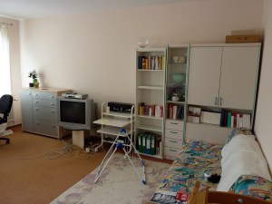 Porte à gauche, le salon/bureau/salle à manger. Je pense que c'est un divan-lit, ça.