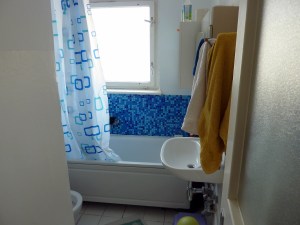 Salle de bain (immédiatement à droite en entrant -- on voit tout juste le cadre de porte dans la photo du corridor).