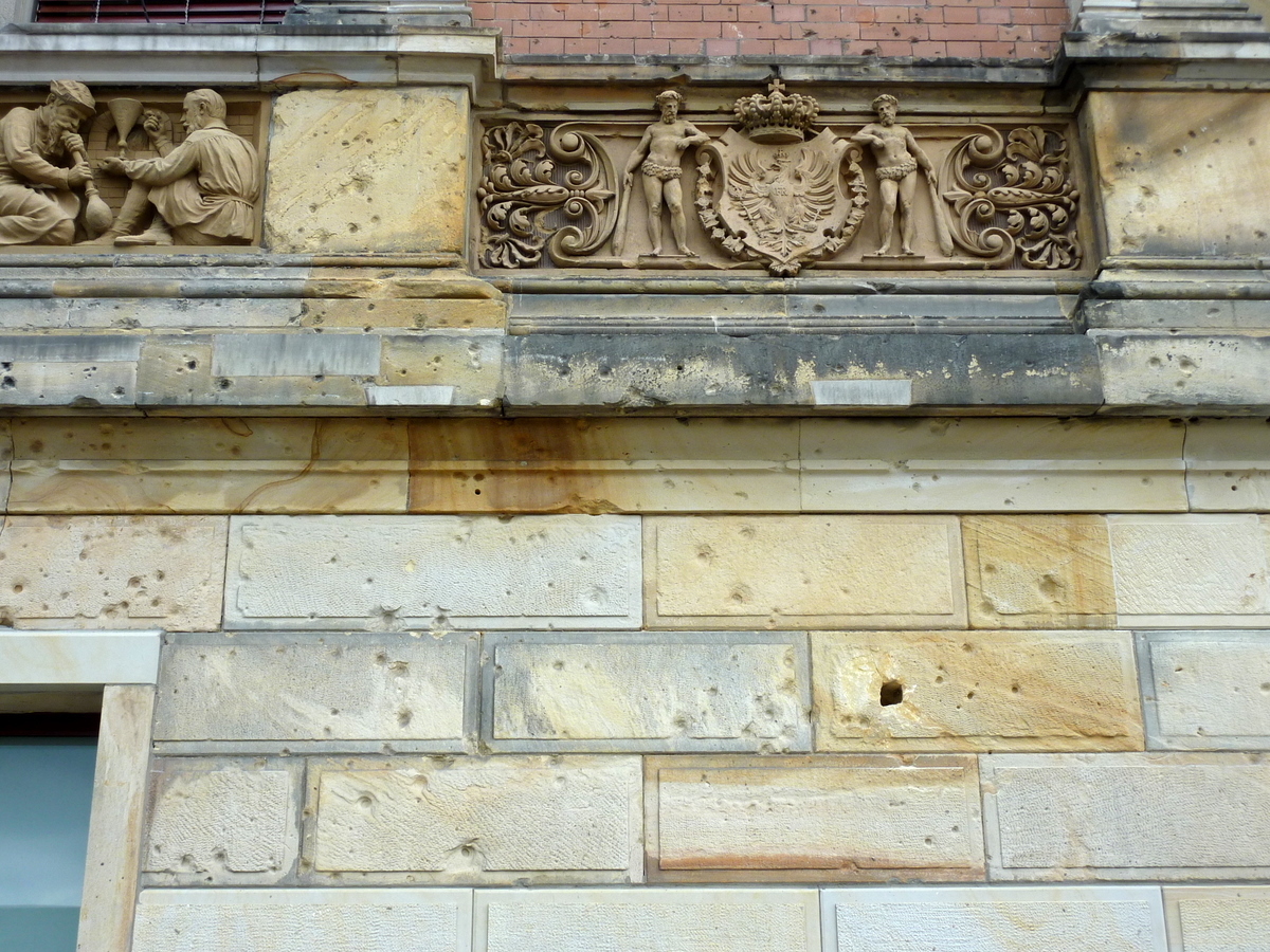 Il y a encore des éclats de balles sur le côté du bâtiment!