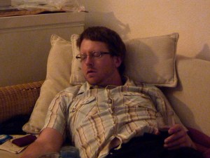 Martin qui s'est endormi pendant que je faisais le blog hier! Sauf que... vous voyez le verre de vin dans sa main? Ben son contenu s'est retrouvé sur le divan et sa chemise quand il s'est réveillé en sursaut. Après application de sel et frottage (heureusement qu'il y avait du détachant à tapis ici), le plus gros est disparu.