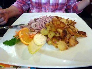 L'assiette à Beate. Des patates et des oignons, sur une... tête fromagée? Je me souviens plus du nom... Anyway, ce sont des morceaux de viande dans une gelée.