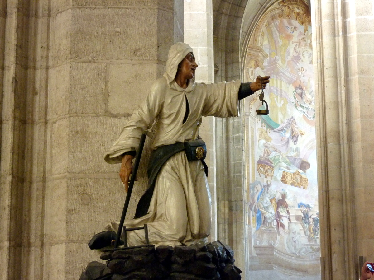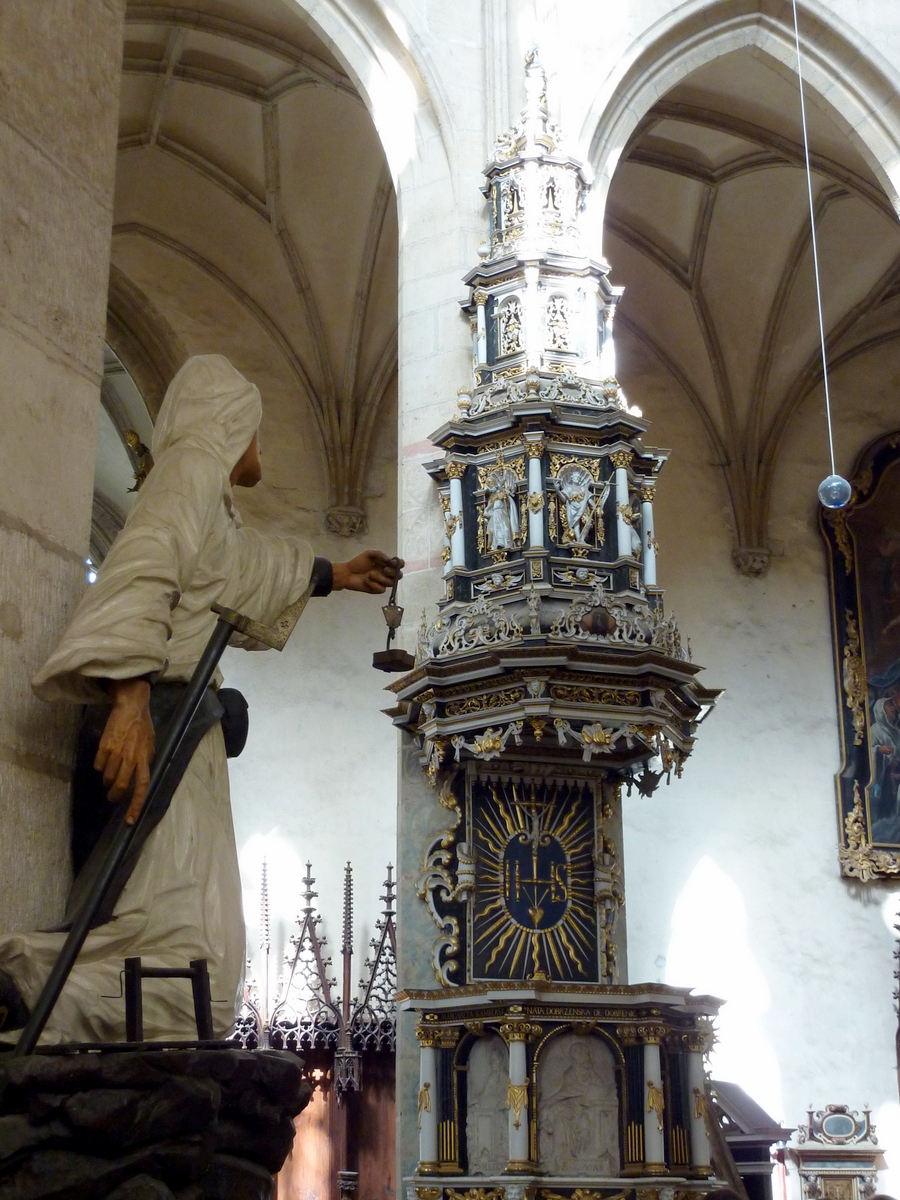 - Kutna Hora était une ville minière (argent). Voici un mineur de l’époque, avec balance, marteau… et tablier retourné. Pourquoi? Pour s’en servir comme toboggan pour accéder à la mine. Une demi-heure pour descendre, 3 heures (non payées) pour remonter. / Kutna Hora was a mining town (silver), and here’s one of them, with scale, hammer… and an apron put on backwards. Why? So he could slide down to the mine. Half a hour to go down, three (unpaid) hours to come back up.