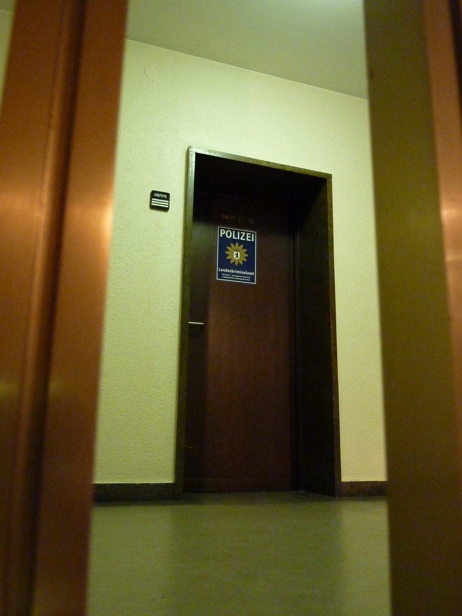 - À l’intérieur du bâtiment, une simple porte de poste de police, mais intimidante quand même. / Inside the building — just a door of a police station, but still intimidating.