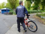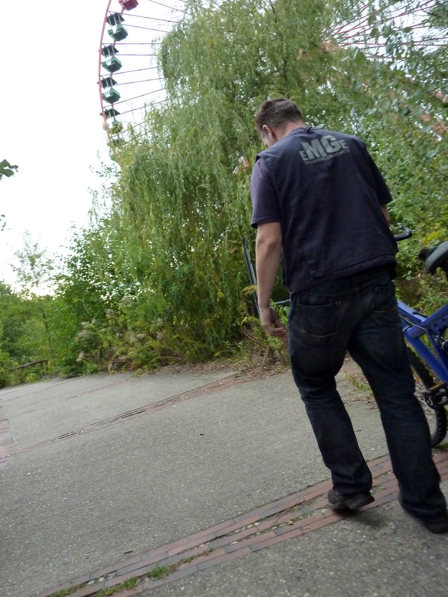 - Le garde qui nous a attrapés. / The guard who caught us. TRANSLATION PREVIOUS PHOTO: Just before we took this picture, a security guard on a bike stops us and says (in German): « This is private property, you can’t be here, etc. ». Beate, quick-witted and fluent in French, says (in French) that we are Quebecer tourists and we don’t speak German. I jump in and add that we don’t speak English either! The guy starts hemming and hawing, then tells us he’s going to call his « Kollege » (hard G), to which I reply (just to mess with him) in French: « College? No, no, we’re not students! ». Eventually he does call his colleague (the guard at the gate). When he asks him (in German) if by any chance he speaks French I almost burst out laughing (remember, I’m not supposed to understand a word). OK, he’ll escort us to the gate. But before that, we beg him to let us take another picture (see above). He seemed like a nice guy, so he said yes.
