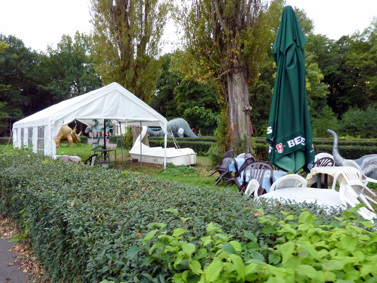 - Tout juste avant de prendre cette photo, un garde en vélo nous intercepte! Il nous dit en allemand : « C’est une propriété privée, vous n’avez pas le droit d’être ici, etc. ». Beate, vive d’esprit et qui parle un français impeccable, lui répond en français que nous sommes des touristes québécois et que nous ne parlons pas allemand. J’embarque et ajoute (toujours en français) que nous ne parlons pas anglais non plus! Le gars commence a pédaler (ho ho) fort et nous mentionne qu’il va appeler son « Kollege » (se prononce avec un g dur), ce à quoi (question d’en rajouter) je réponds en français : « Collège? Non non, nous ne sommes pas des étudiants! ». Il finit par appeler son collègue (le gars à la porte). Quand il lui demande (en allemand) si par hasard il ne parle pas français, j’éclate presque de rire (souvenez-vous, je suis supposé rien comprendre). OK, il va nous escorter à la porte principale. On le supplie de nous laisser prendre au moins une autre photo (ci-contre), et il accepte, le chic type. / TRANSLATION NEXT PHOTO.