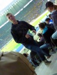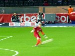 - Action shot, puis c’est l’entracte! Berlin a complètement dominé la première demie, mais ce n’est que 1-0 (Dresden a marqué dans son filet — une déviation par une tête). Le gardien de Dresden a aussi fait un arrêt fantastique avec le poing, alors qu’il était assis sur sa ligne de but! / Action shot, then it’s halftime. Berlin completely dominated the first half, but is still leading only 1-0 (Dresden made an own goal — deflected off a defender’s head). The Dresden goaltender also made an amazing game, punching the ball away while he was sitting on his own goal line!