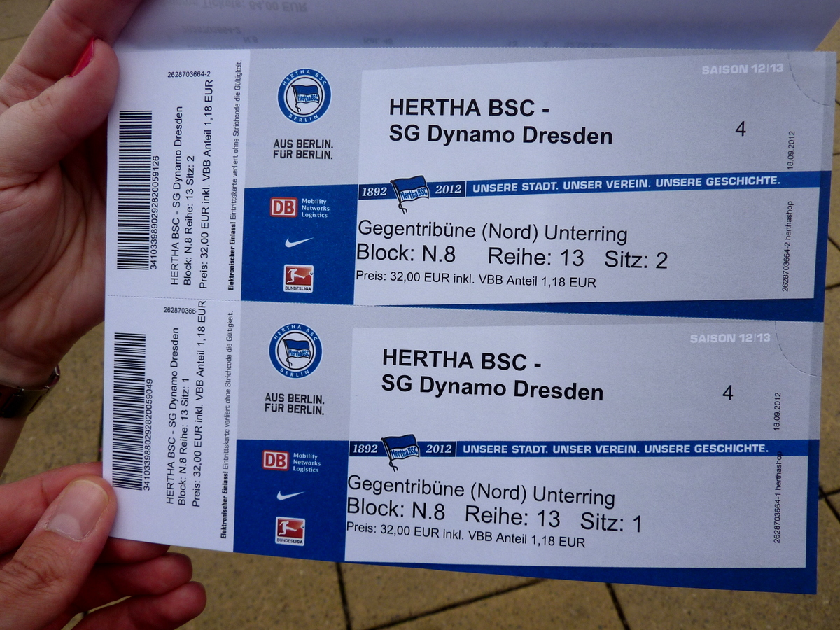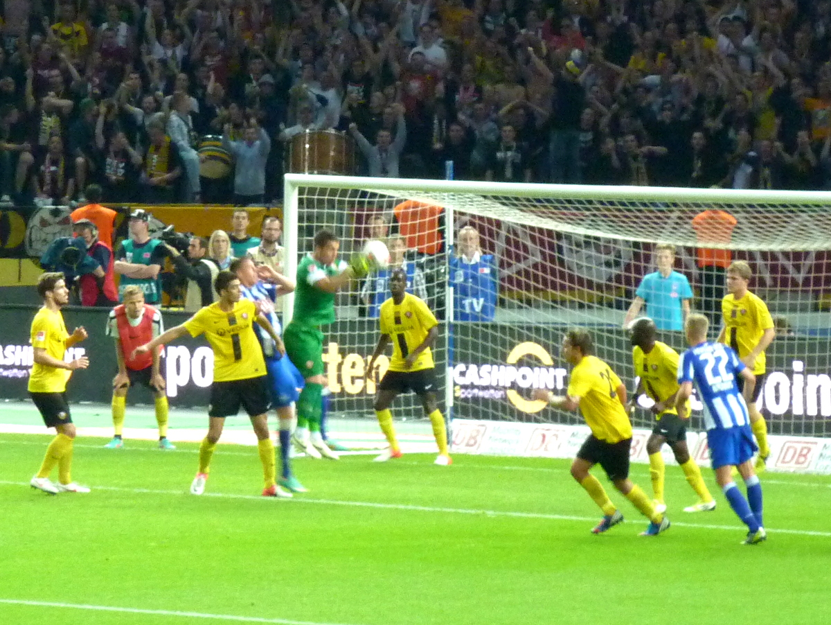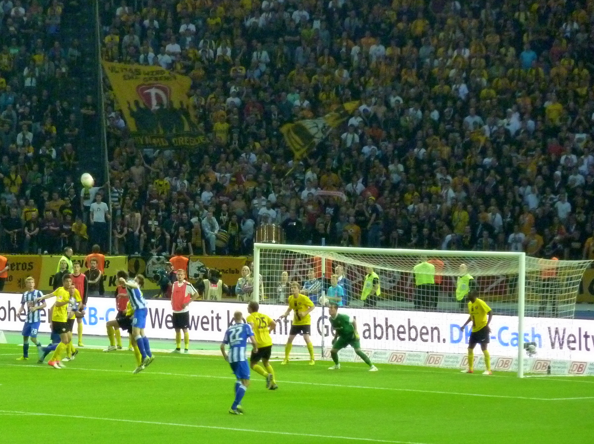 Hertha won the game 1-0 and completely dominated. They scored (own goal) at the 5th minute and were never threatened afterwards. The atmosphere was pretty good, though. Dynamo Dresden fans have a bad reputation throughout the league (they’ve had a few hooligan-like incidents), but their fans are true die-hards — and were fairly well-behaved today.