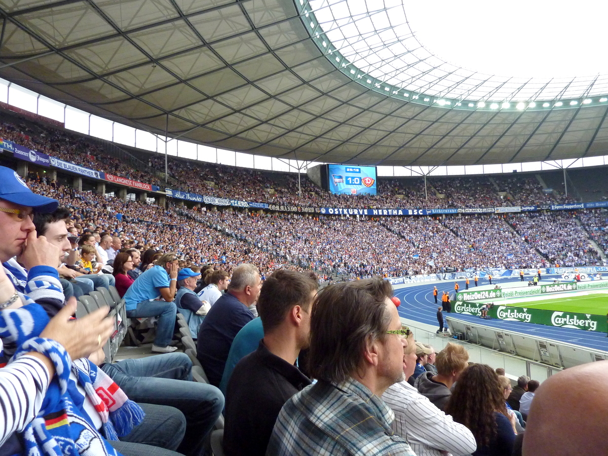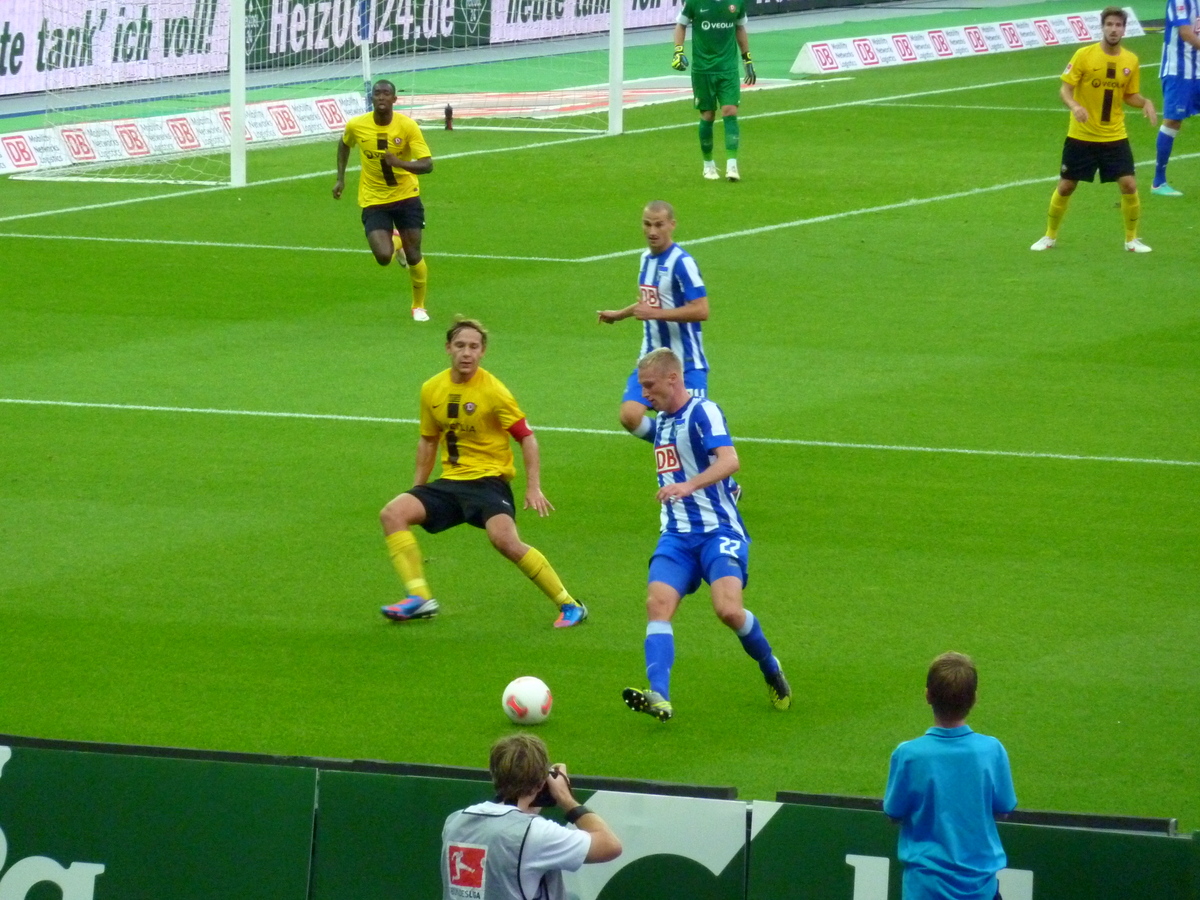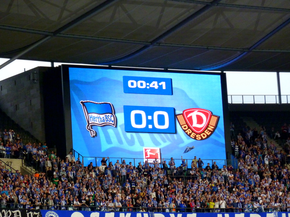 Hertha a remporté la victoire 1-0, et a complètement dominé le jeu. Ils ont marqué à la 5e minute (le défendeur de Dresden l’a fait dévié avec la tête dans son propre but) et n’ont jamais été menacés par la suite. L’atmosphère était pas mal bonne, par contre. Les fans de Dynamo Dresden ont une mauvaise réputation dans toute la ligue (semi-hooligans, disons), mais leurs partisans sont loyaux à mort et se sont plutôt bien comportés aujourd’hui.