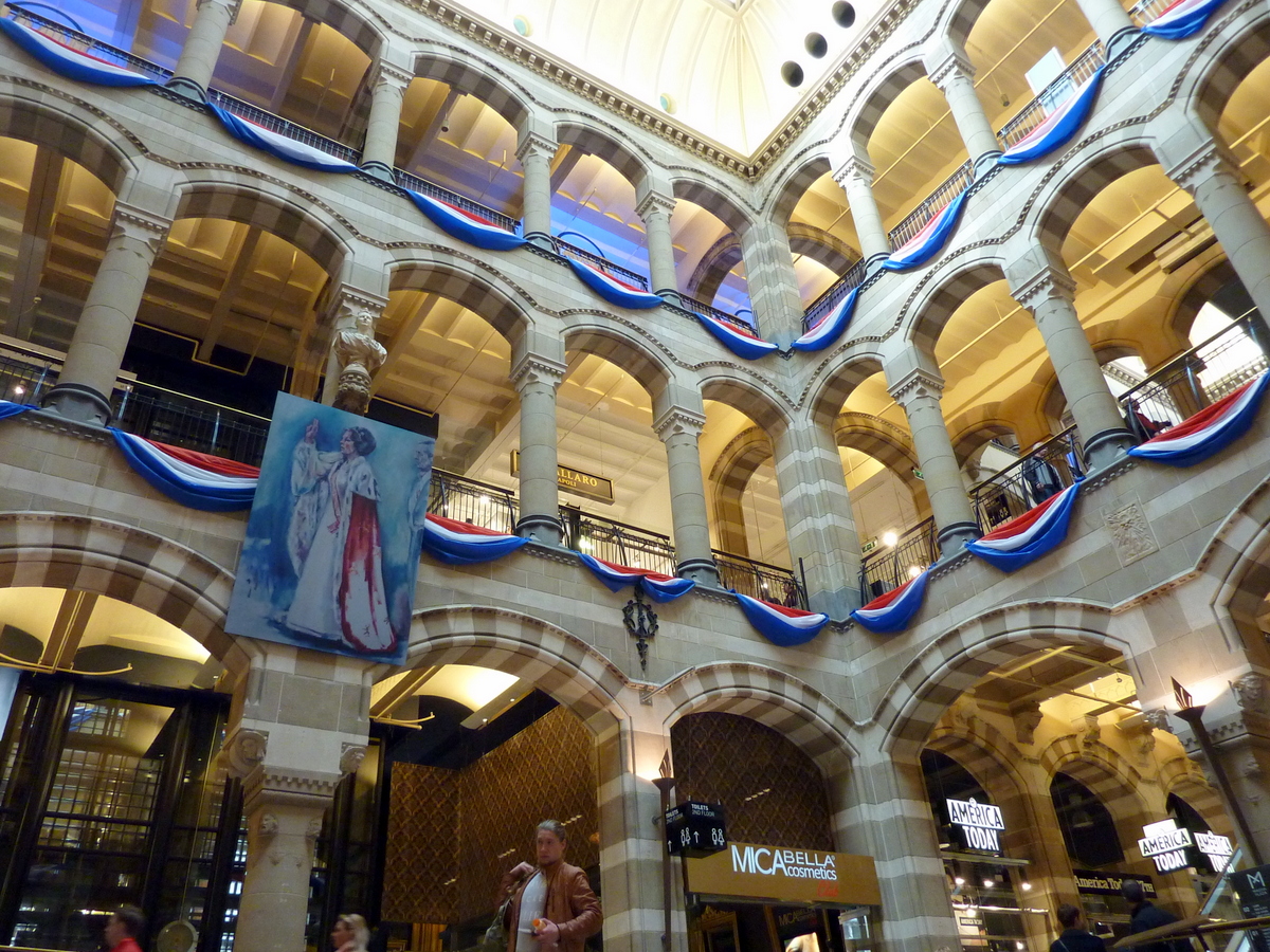 Après le tour, l’intérieur de la Magna Plaza, centre commercial. Le portrait de la reine est pour la cérémonie de sa succession, fin avril. / After the tour, inside the Magna Plaza, a nice shopping mall. The queen’s portrait is for its soon-to-be … uh, resignation, abdication? at the end of April.
