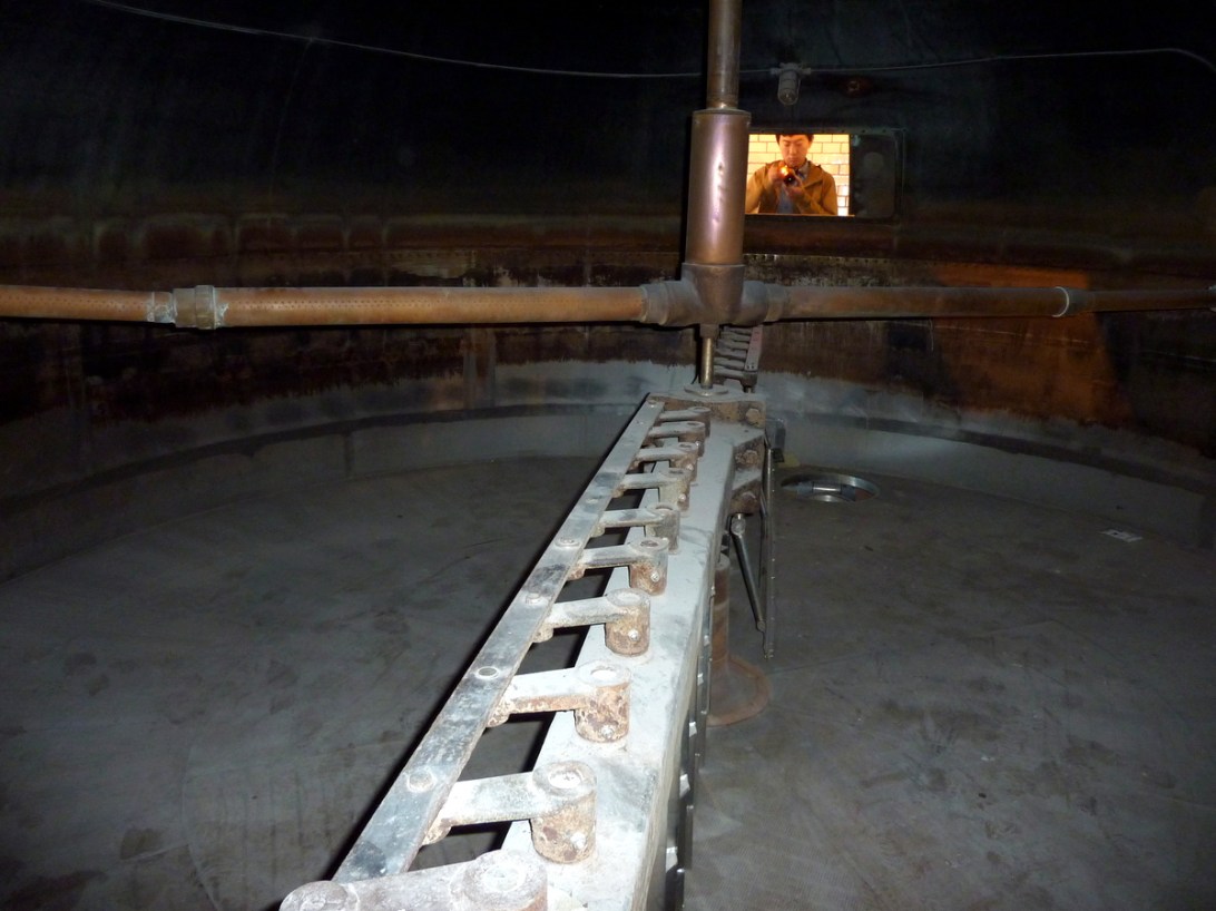 À l’intérieur d’une des grosses cuves. / Inside one of those big vats.