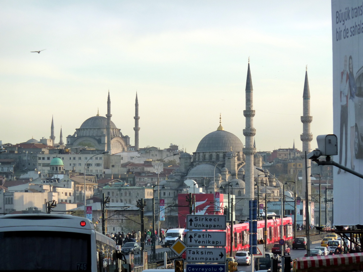 Zoom! La Nouvelle Mosquée à droite, palais Topkapi à gauche (je pense). / Zoom! The New Mosque on the right, Topkapi Palace on the left (I think).
