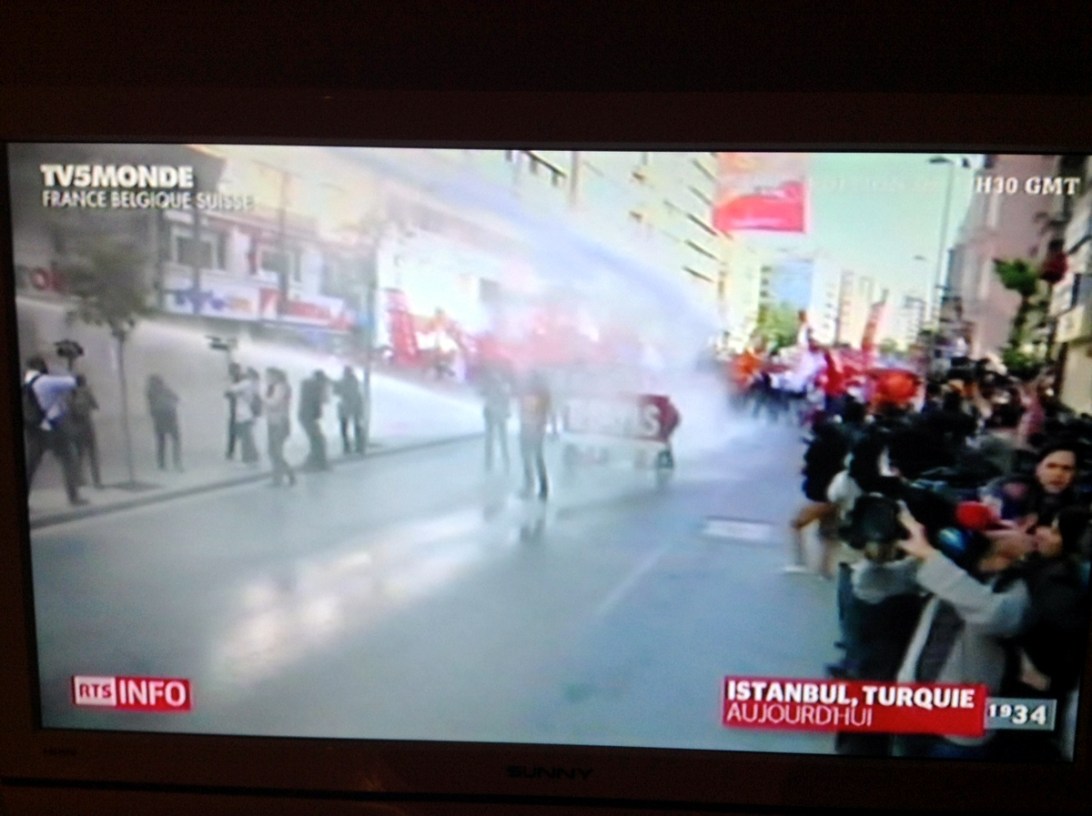 Les deux Québécois sympathiques d’hier m’avaient mentionné que ça risquait de brasser sur la place Taksim. J’ai été tenté d’aller voir, mais je suis content de m’être ravisé. / The two super-nice Quebecers told me yesterday that there might be some action at Taksim Square. I considered going, but I’m glad I didn’t.