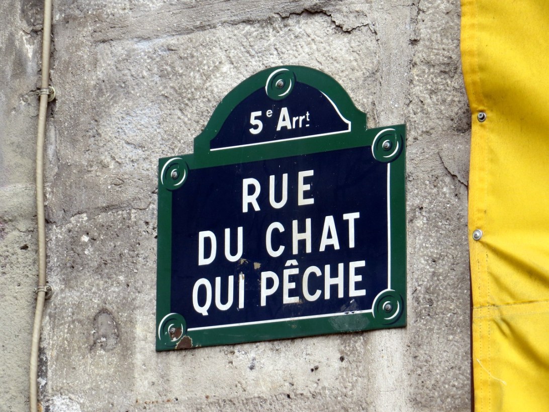 Excellent nom, prêt de la rue du Chien qui pisse. / Fishing Cat Street, near Pissing Dog Avenue.