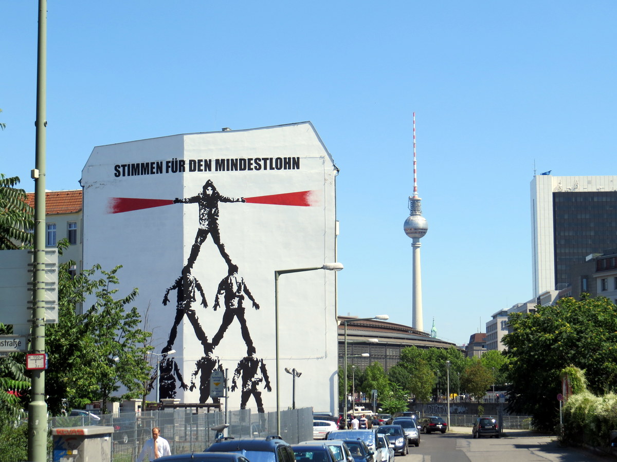 Marche vers le sud… « Des voix pour le salaire minimum », avec la tour d’Alexanderplatz en arrière-plan. / Going south… « Voices for minimum wage », with the Fernsehturm at Alexanderplatz in the background.