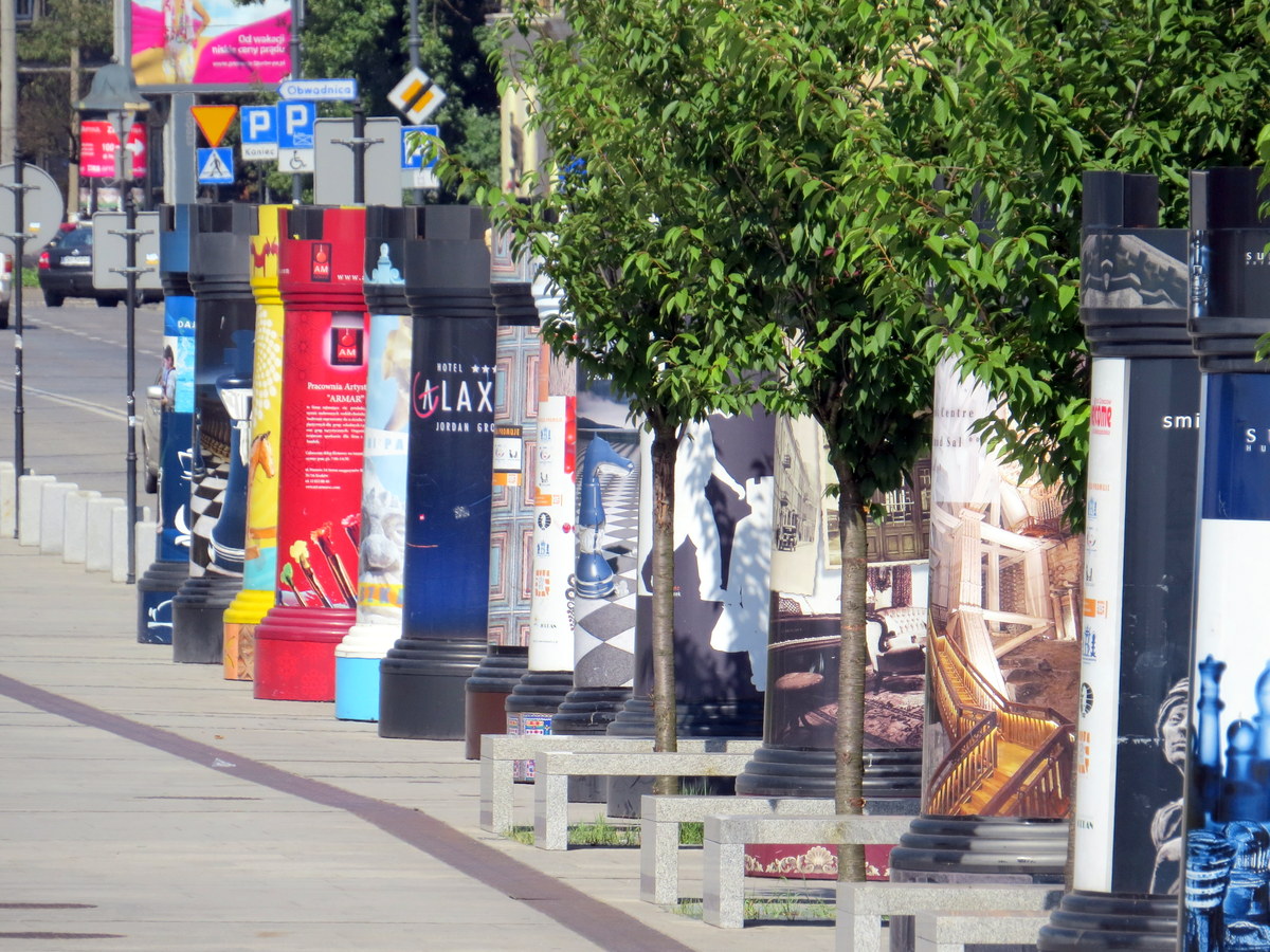 Belle touche! Des colonnes publicitaires en forme de pièce d’échecs. / Nice touch! Advertising columns in the shape of chess pieces (rook).
