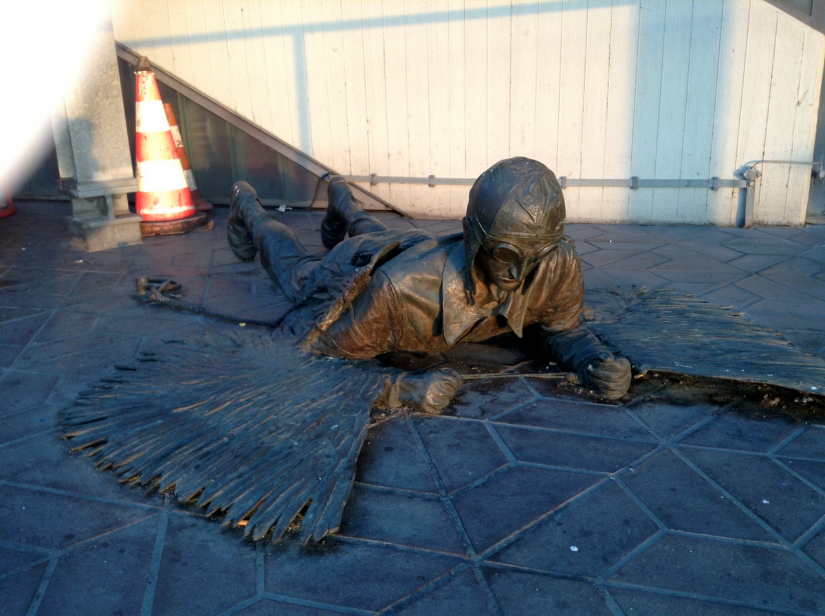 Aéroport Tegel. « Der Fall Daidalos und Ikaros », de Rolf Scholz, représentant Otto Lilienthal, pionnier de l’aviation allemand. / Tegel Airport. « Der Fall Daidalos und Ikaros », from Rolf Scholz, representing Otto Lilienthal, German aviation pioneer.