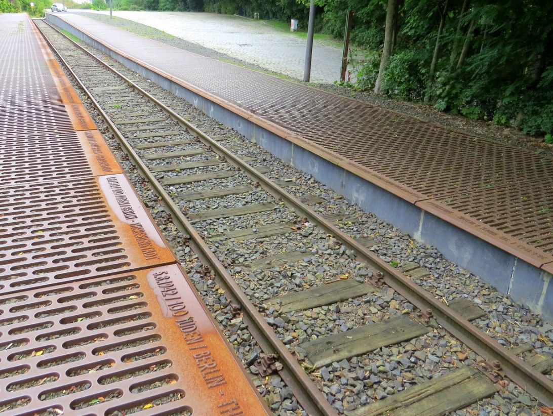 Deux pistes de chemin de fer avec la quantité de Juifs déportés à chaque voyage. Plus de 50 000 au total. / Two railroad tracks, with the number of Jews deported on each trip. More than 50,000 total.