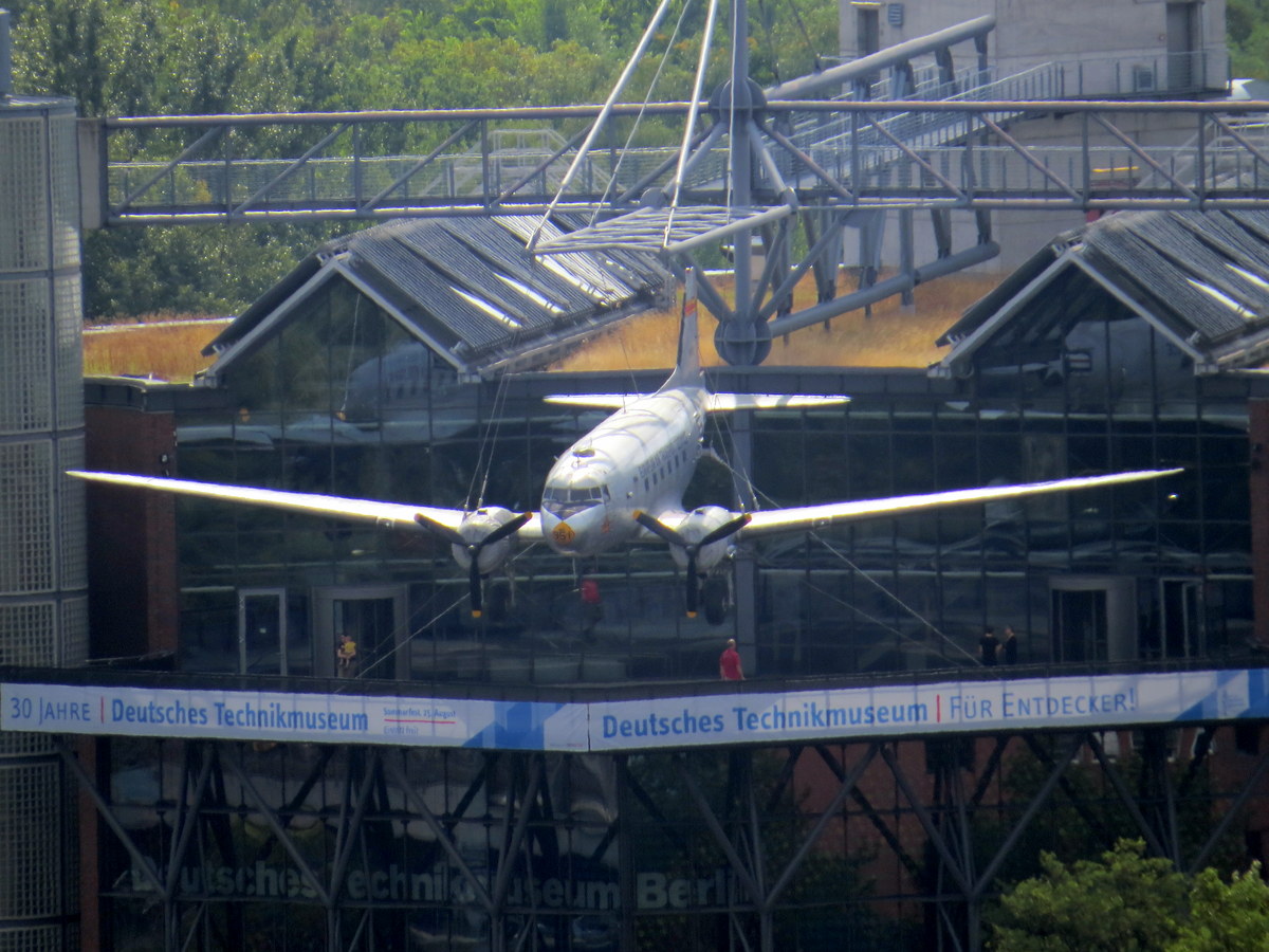 Le Musée allemand de la technique, avec son bombardier (un vrai) au-dessus de la façade. / The German Museum of Technology with an actual bomber plane above its entrance.
