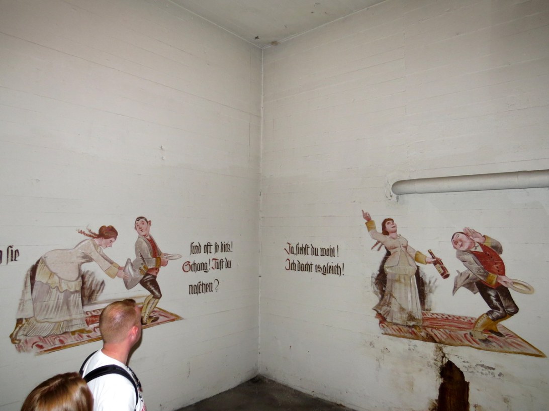 Un abri contre les bombardements, avec des dessins humoristiques. / A bomb shelter, complete with funny drawings.