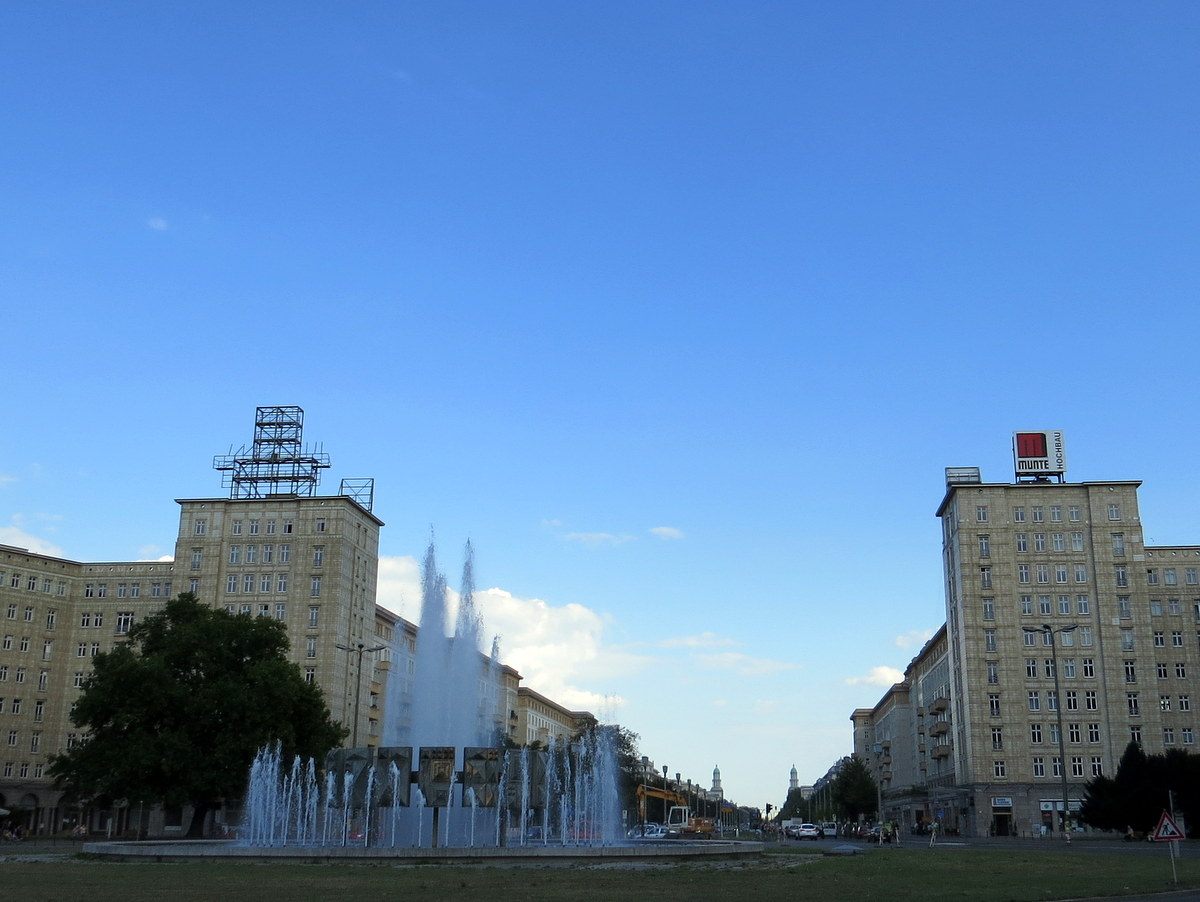 Strausberger Platz, avec les deux tours de la Frankfurter Tor en arrière-plan. / Strausberger Platz, with the two towers at Frankfurter Tor in the background.
