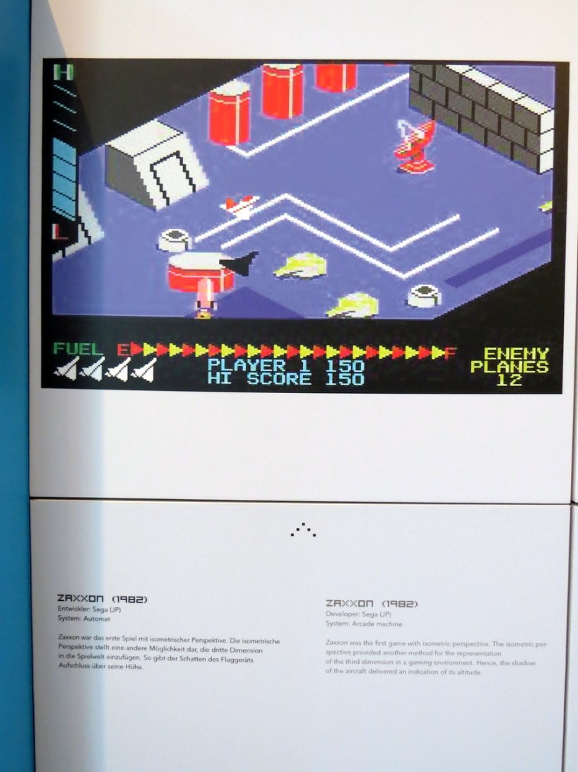 Zaxxon (1982). Le premier jeu à perspective isométrique. L’ombre indiquait l’altitude du vaisseau. / Zaxxon (1982). The first game with isometric perspective. The shadow showed the aircraft’s altitude.