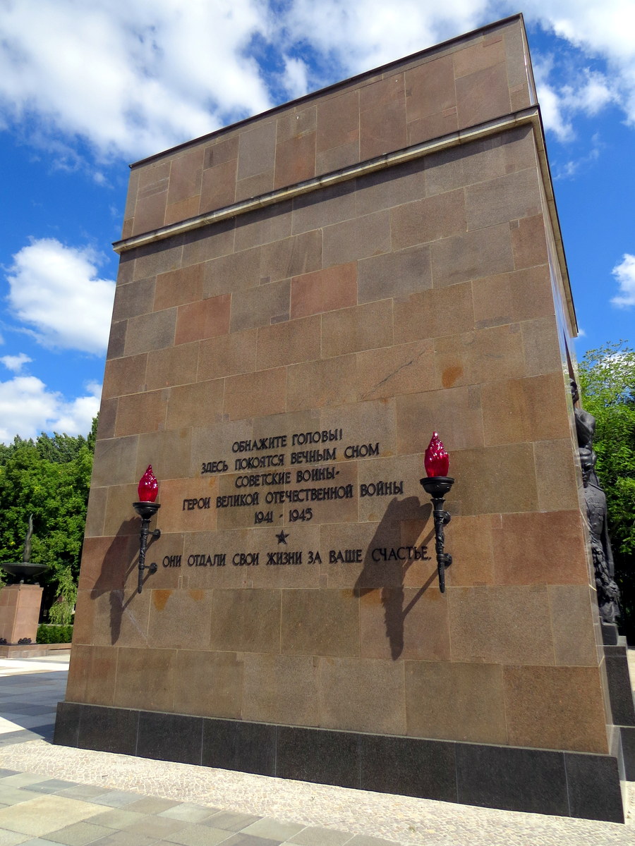« Enlevez votre chapeau! Ici reposent des soldats soviétiques, héros de la guerre 1941-1945. » / « Uncover your head! Here are Soviet soldiers, heroes from the great war 1941-1945, laid to eternal rest. »