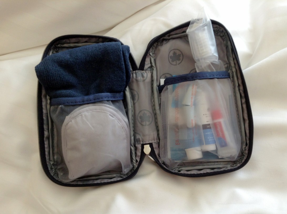 Air Canada a remonté dans mon estime. Après que j’ai mentionné en douce à une des agentes de bord que c’était notre lune de miel, elle est venue nous donner deux verres de champagne et deux trousses de voyage! Nice! / Air Canada went way up in my books. After I discreetly told one of the stewardesses about our honeymoon, she later gave us two glasses of champagne and two travel kits. Nice!