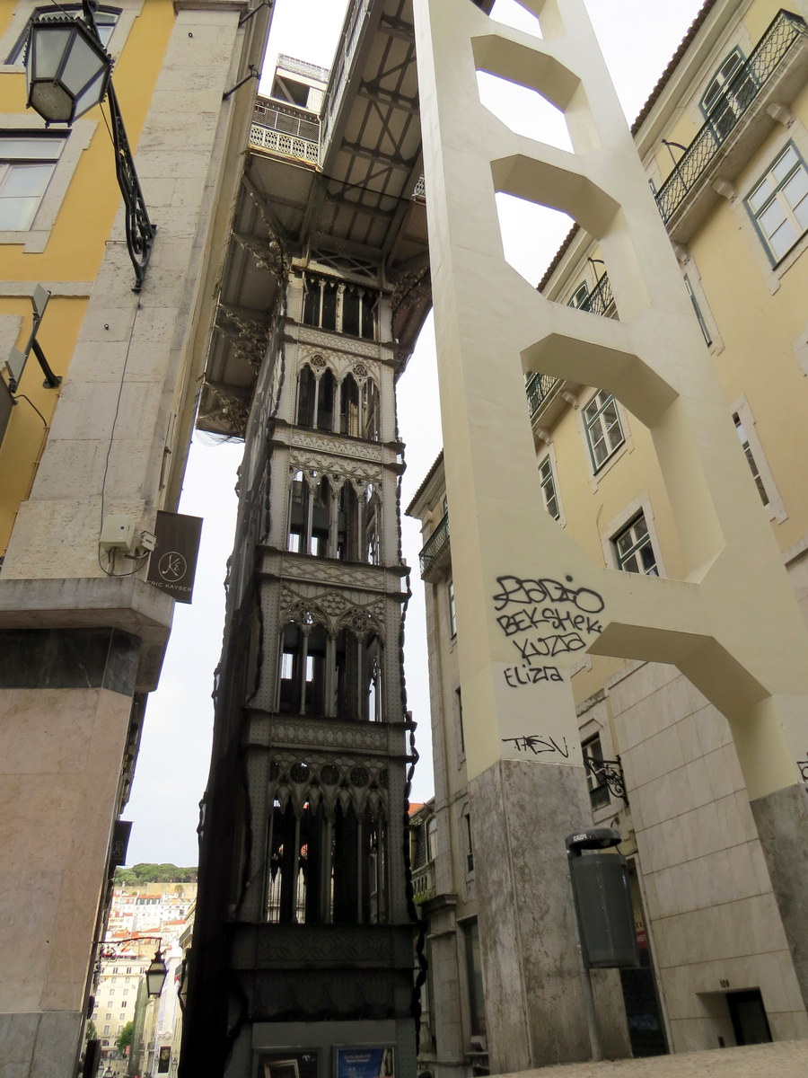 OK, la tour de tout à l’heure? Voici! Le Santa Justa Lift, construit en 1902. / OK, the tower from earlier? Here it is, the Santa Justa Lift, built in 1902.