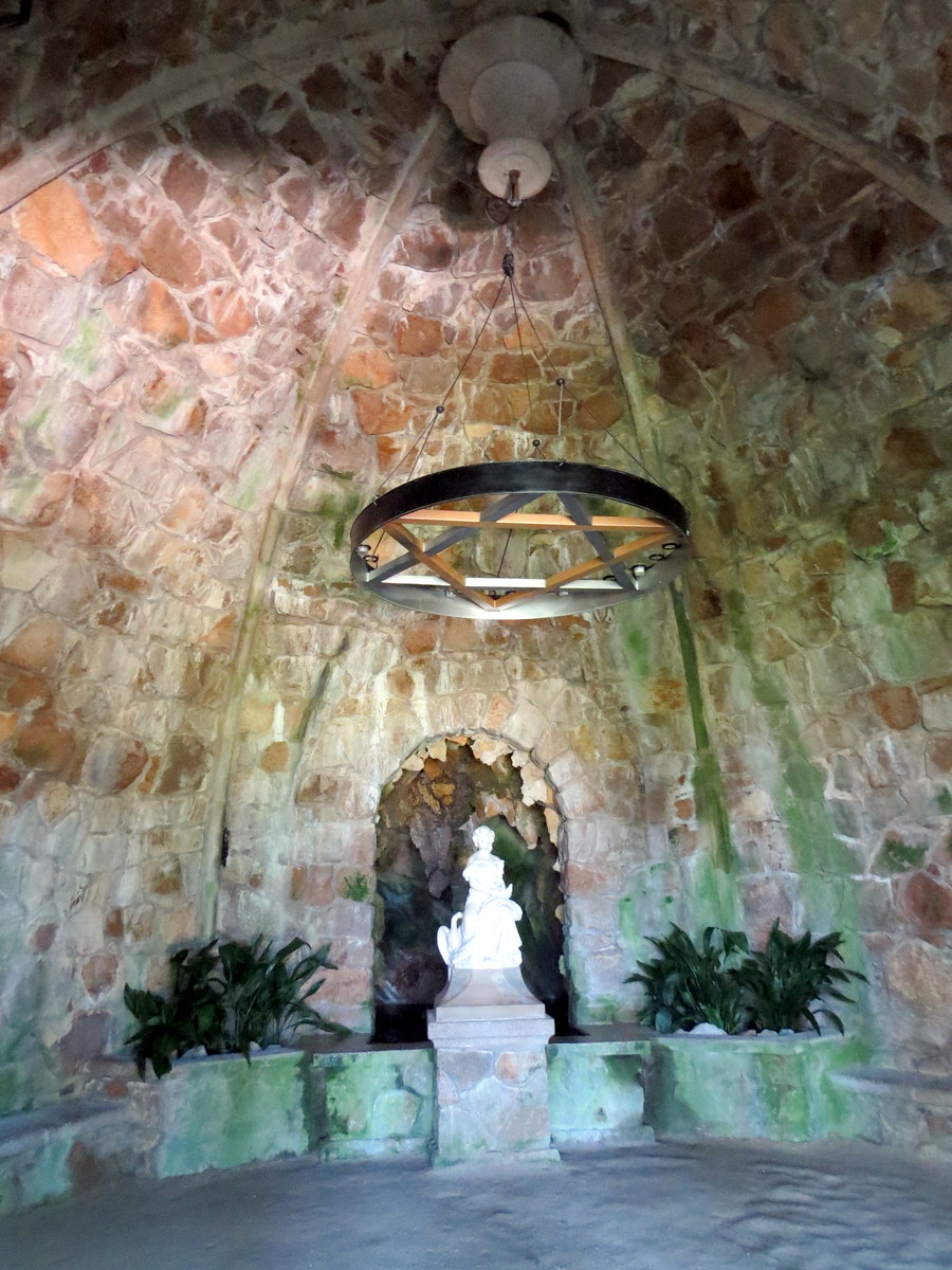 Une petite grotte avec une statue dedans. / One of many small caves with a statue inside.
