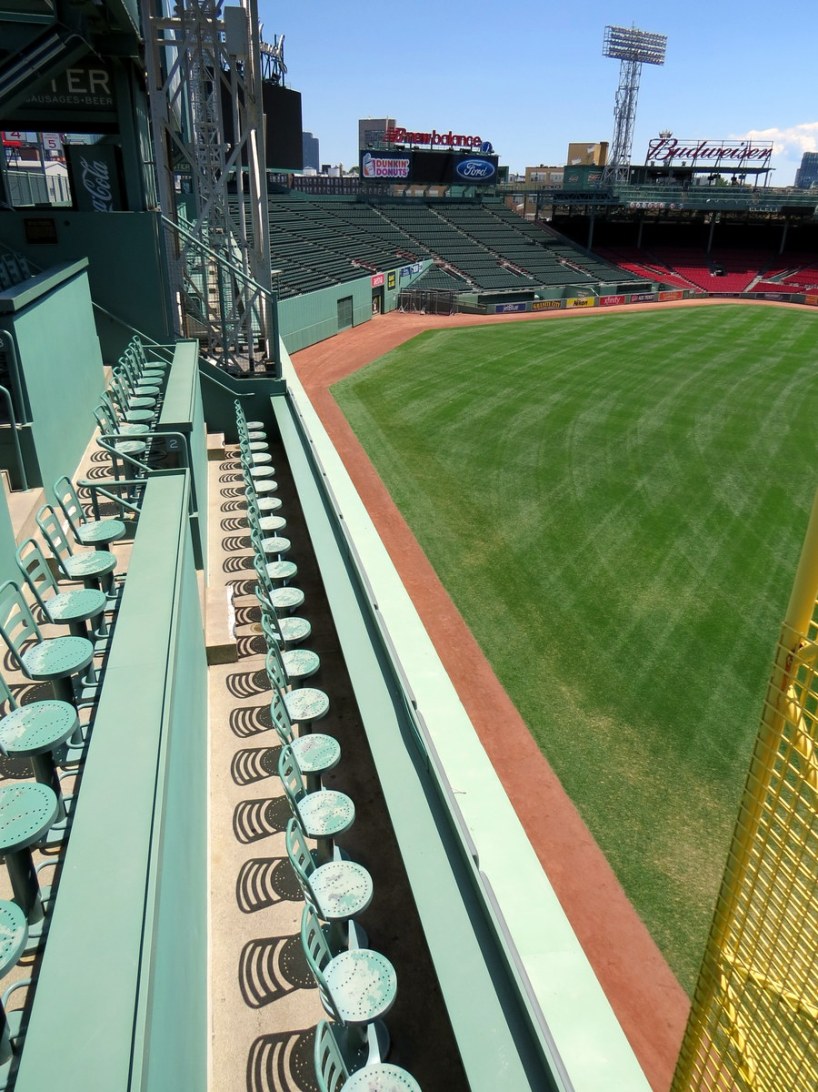 Maintenant dans les estrades du champ gauche, au-dessus du Green Monster (clôture). / Now in the stands on top of the Green Monster (left field wall).