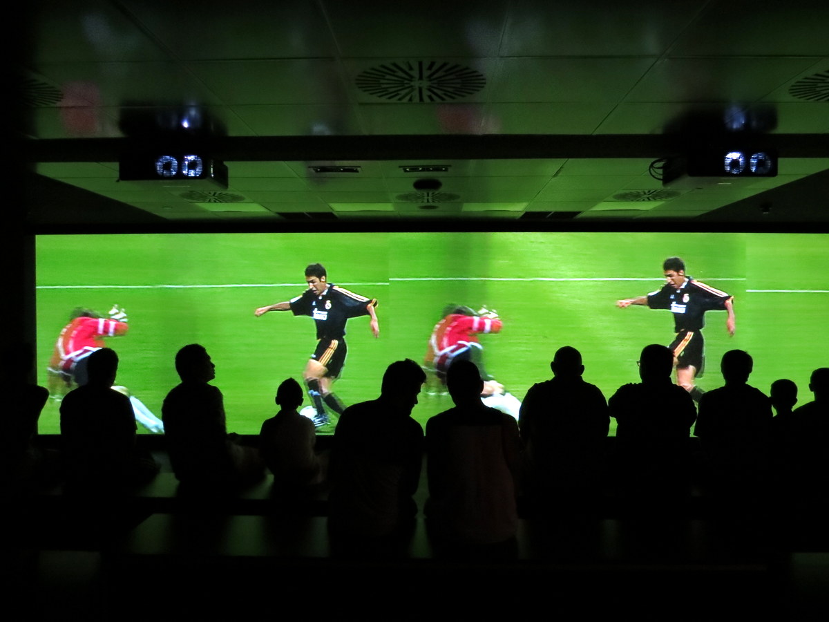 J’aime bien cette photo. Silhouettes de spectateurs devant des faits saillants des dernières saisons. / I like this shot. Silhouettes of people watching highlights of the last few seasons.