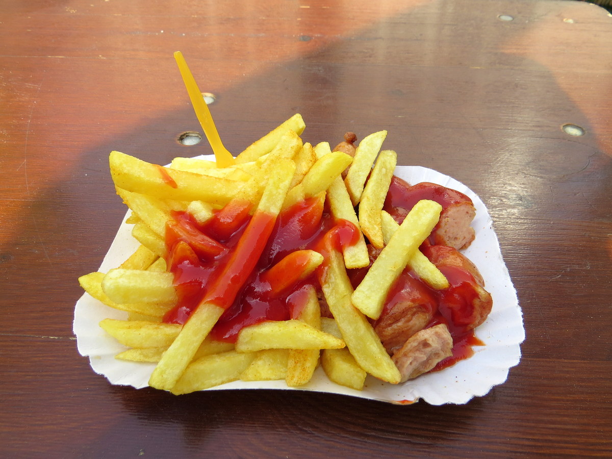 Déjeuner à 8 h environ, sorti de la vers 15 h. Je crève de faim. Quoi de plus berlinois qu’une currywurst? Ça manquait de paprika (selon la tradition), mais c’était quand même bon! / Breakfast at 8, and I got out of there at 3, so I was starving. Gotta go Berliner and have a currywurst! Not enough paprika (according to the traditional recipe), but still pretty good!