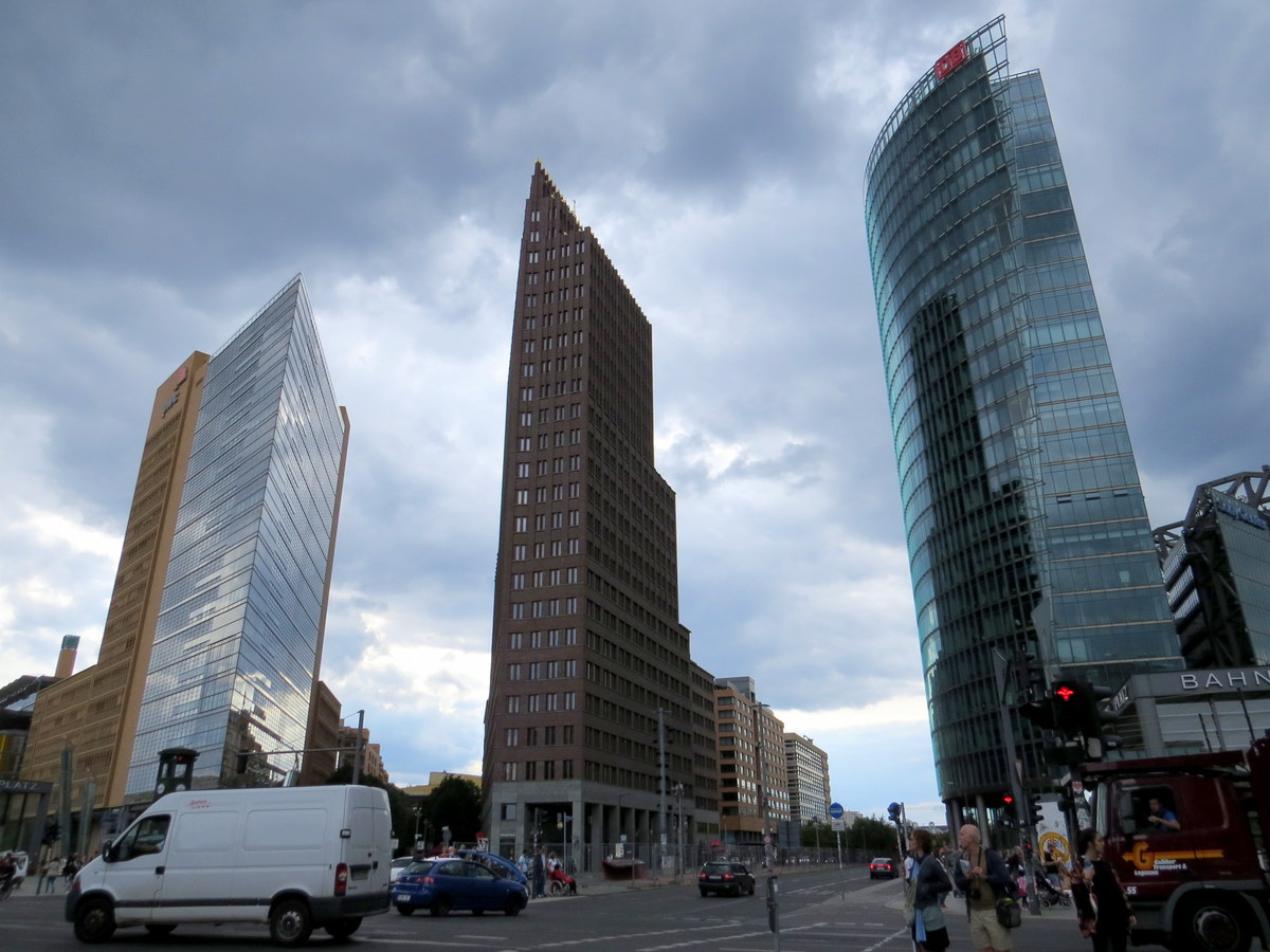 Potsdamer Platz, menaçante avec ces nuages. / Potsdamer Platz, gloomy under those clouds.