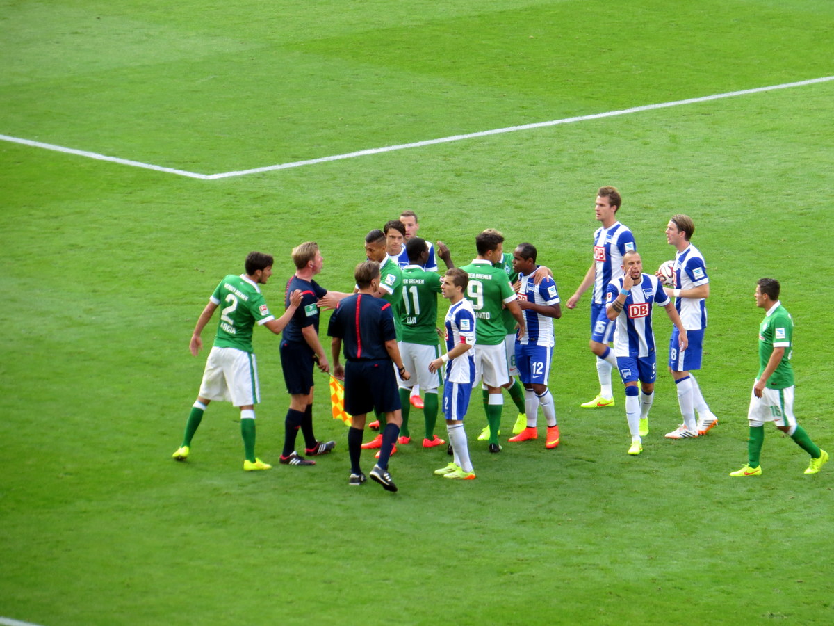 Un joueur de Bremen donne un coup de coude à un adversaire loin du jeu. Ça aurait dû être un carton rouge (expulsion), mais ça a seulement été un jaune (avertissement). On dirait que le Hertha a complètement perdu sa concentration après ça. / A Bremen player elbows a Hertha player away from the play. It should have been a red card (player sent off), but it was only a yellow (warning). It seems Hertha completely lost its focus after that.