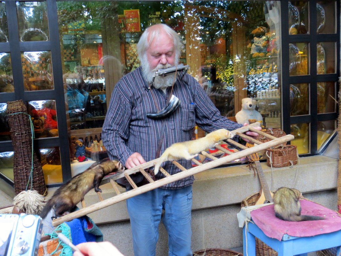 Dans le Nikolaiviertel, un gars s’amuse avec des furets. / In Nikolaiviertel, a guy’s having fun with his ferrets.