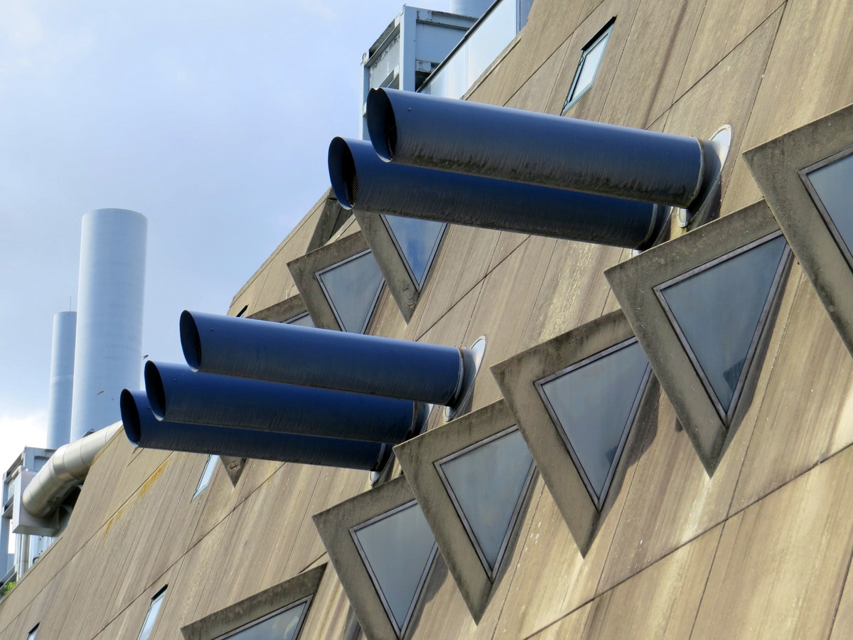 Construit à la fin des années 60 selon le modèle brutaliste. Ça, ce sont des tuyaux de ventilation. / Built in the late 60s in the brutalist style. Those are air vents.