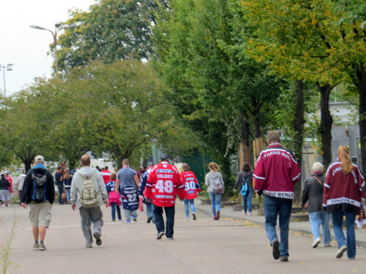 Ah, ça me manquait, ça. Des gens en route vers l’aréna vêtus de gilets des Eisbären. / Ah, I’ve missed that. People with Eisbären jerseys walking to the arena.