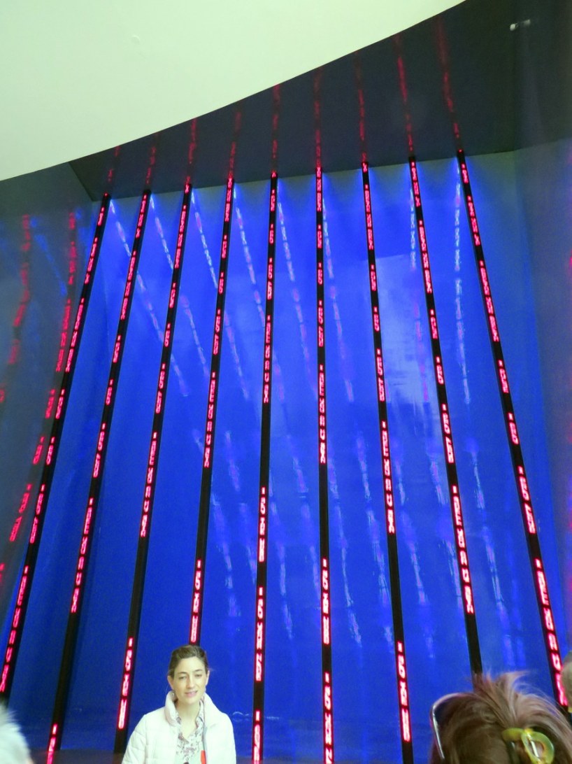 Un poème (d’un auteur connu que j’ai oublié) en anglais, espagnol et basque reproduit sur 9 bandes géantes à DEL. / A poem in English (from a known author whose name I forgot), Spanish and Basque shown on 9 giant LED-strips.