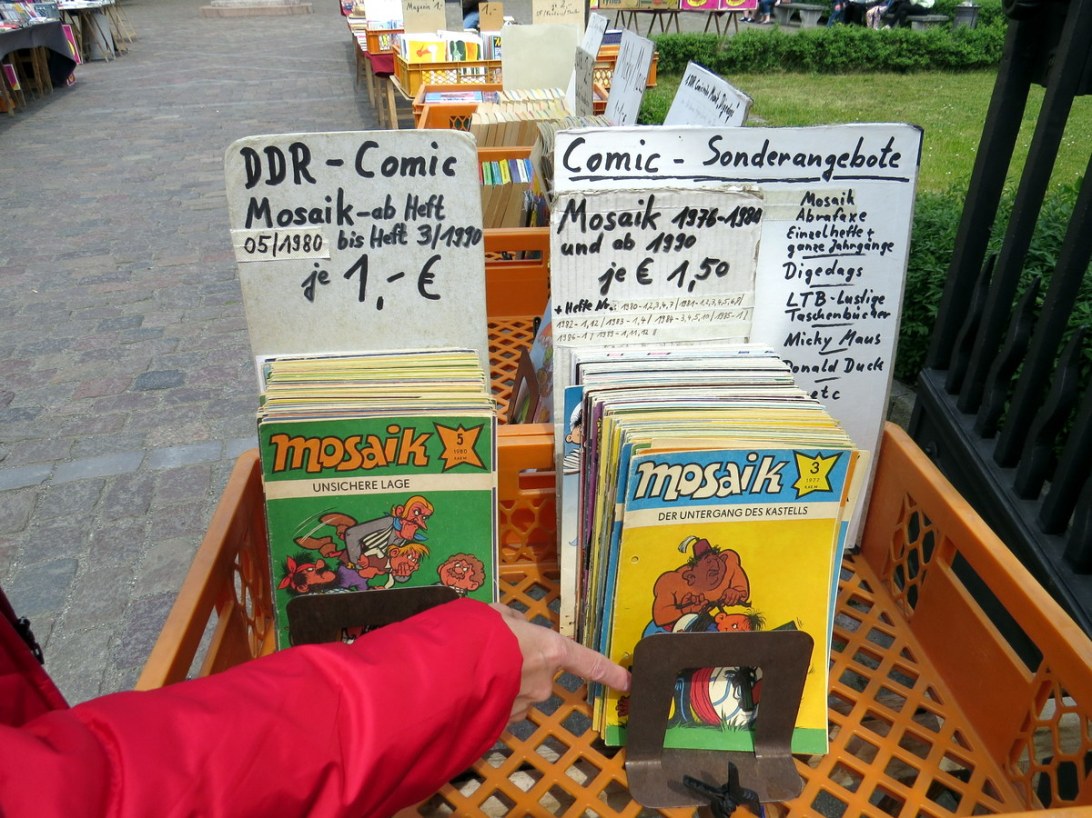 Il y avait des livres à vendre à la Humboldt Universität, dont des bandes dessinées que Beate connaissait! (ex-Allemagne de l’Est). / There was a book sale at the Humboldt Universität, and a few comic books Beate knew about (former East Germany).