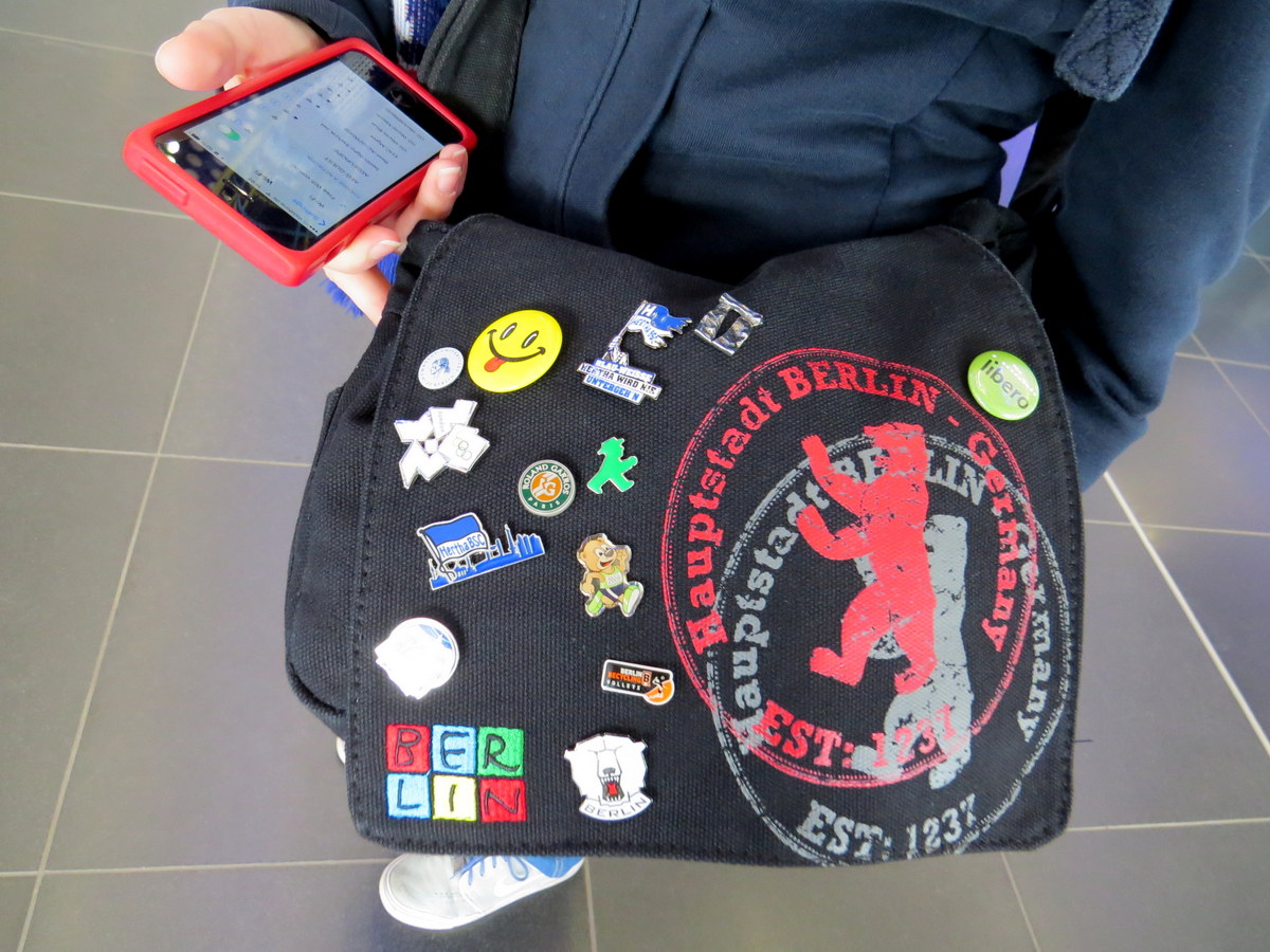 La sacoche à Maria, avec tout plein d’épinglettes cool — Olympiques de Londres, Roland Garros, Eisbären (hockey), etc. / Maria’s bag, with a ton of cool pins — London Olympics, Roland Garros, Eisbären (ice hockey), etc.