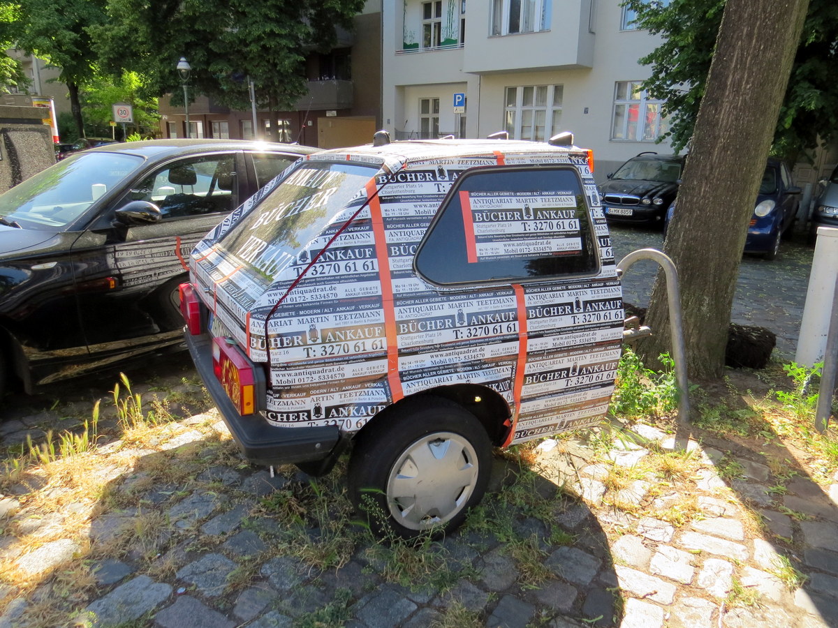 Oh man, trop cool! Une moitié d’auto transformée en remorque! (Publicité d’une librairie seconde main.) / Whoa, this is nice! Half of a car, turned into a trailer! (The ad on it is for a second hand bookstore.)