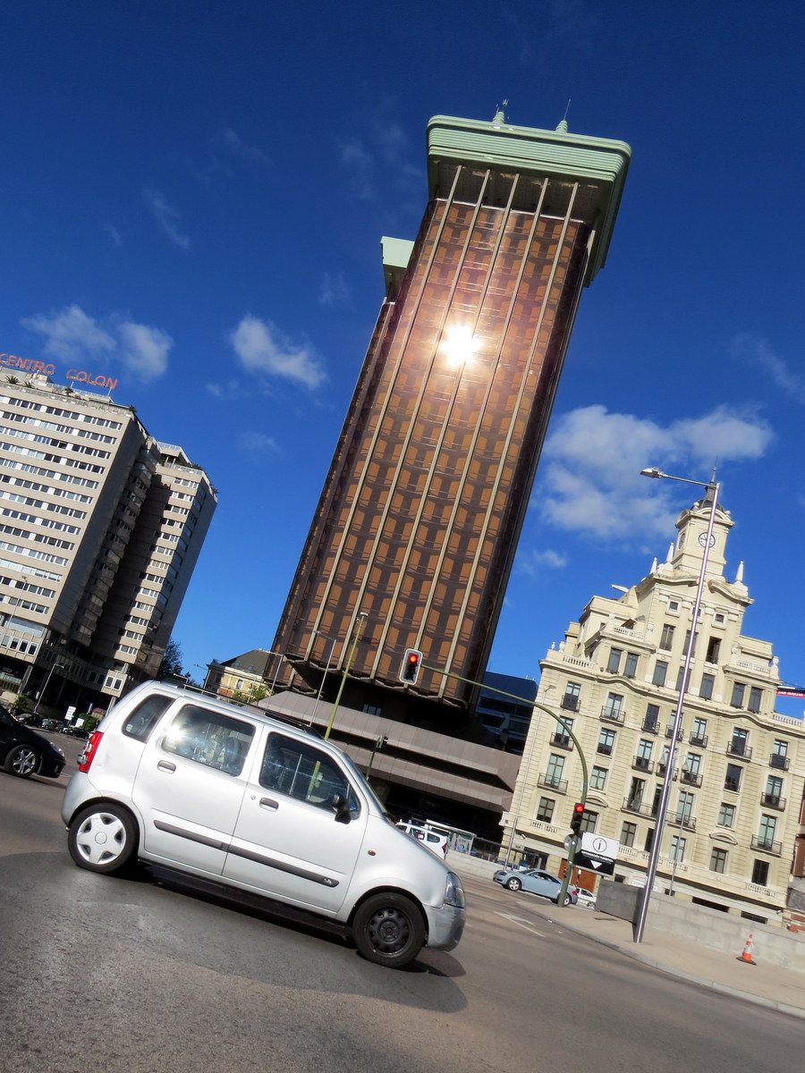 Les Torres de Colon (on n’en voit qu’une). J’ai pris la photo en ninja, sans retoucher l’angle. Avec le reflet, c’est un coup de chance. / The Columbus Towers (though we only see one). I took this one ninja-like. With the sun hitting it, it comes out OK.