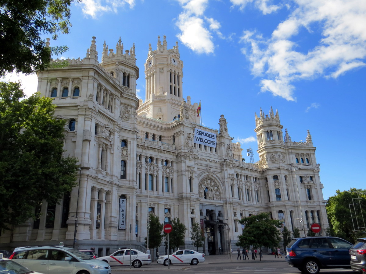 Le Palacio de Cibeles, avec un signe REFUGEES WELCOME. Nice. / The Palacio de Cibeles, with a REFUGEES WELCOME sign. Nice.